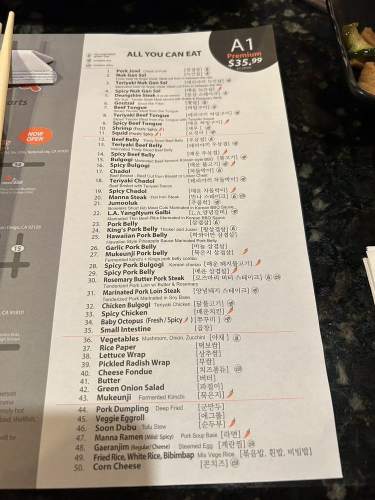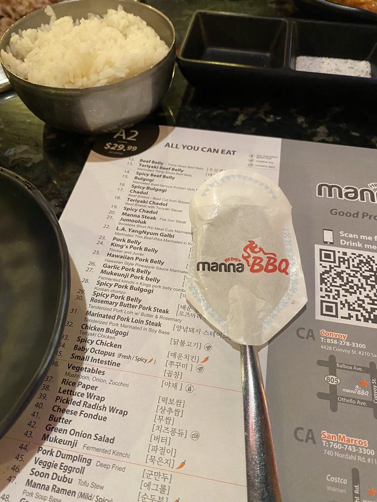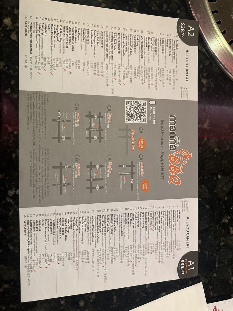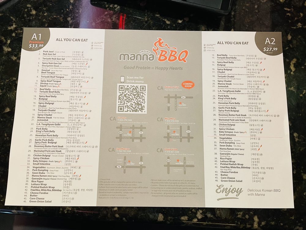 Welcome to Manna Heaven BBQ, a delightful gem located at 740 Nordahl Rd, San Marcos, CA. This Korean barbecue restaurant combines a vibrant dining experience with a menu that is sure to tantalize your taste buds. Dive into the luscious Manna Fresh/Marinated Meat Combos, featuring an array of premium meats like ribeye, galbi, bulgogi, and pork belly, perfect for sharing with friends and family. Each combo includes a refreshing salad mix and a choice of steamed rice or glass noodles, making it a well-rounded feast.